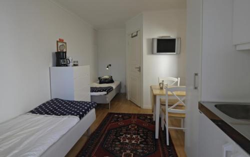 I tvåbäddsrummets kök med kylskåp kan du förvara och tillaga mat. Tvåbäddsrummet har eget badrum, egen ingång, en te- och kaffekokare samt en uteplats. I enheten finns 2 sängar.
