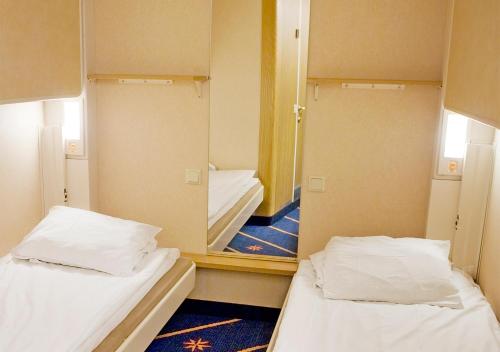 This cabin comes without a window under the car deck and can accommodate up to 4 people. There is an internal phone, air conditioning, toilet, shower and towels. A baby cot for a child weighing up to 10 kg fits into the cabin.